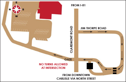 - To enter Carlisle Barracks, you must enter off of Claremont Road. Pay special attention to the posted “NO TURN” signs. DO NOT follow your GPS, it may result in an improper entry attempt onto Carlisle Barracks. Signs are posted on Claremont Road; follow them to the “Claremont Gate” Access Control Point. Turn onto Jim Thorpe Road from Claremont Road and loop around to the Security Guards (map below) and follow the special event signage.