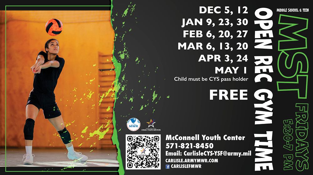 🎉 Friday nights just got way more fun! Carlisle Barracks CYS Middle School & Teen (MST) program is kicking off Open Rec Gym Time with a high‑energy Sports Night Fridays from 5:30–7:00 p.m.
